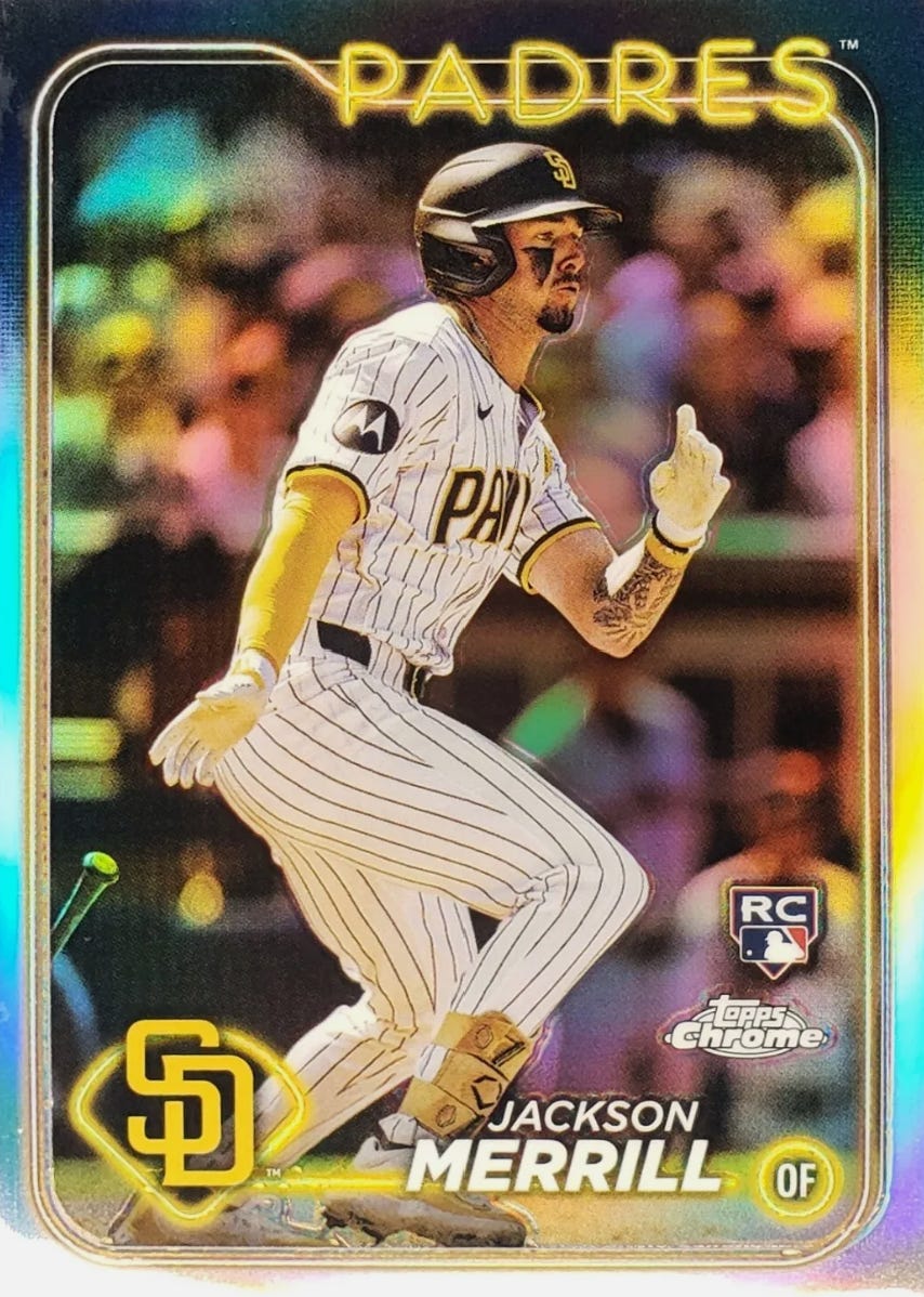 His 2024 Topps Chrome refractor #207 sells on eBay in the $10-$15 range but has been increasing in price recently with his and the Padres surge. You can also find X-fractors and Ray Wave cards around $20.